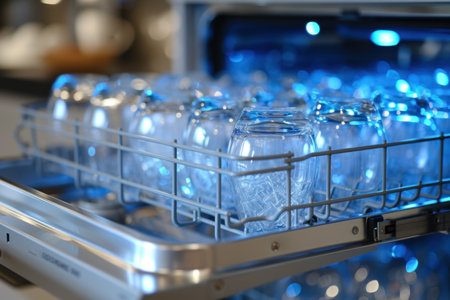 A close-up view of a dishwasher filled with water, highlighting the interior design and lighting. The water is visible in the bottom chamber of the appliance, ready to facilitate the cleaning process.