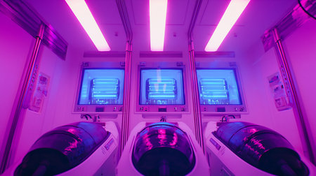 A low-angle view of a futuristic interior featuring vibrant purple lighting and three prominent blue-lit screens, creating a high-tech atmosphere.