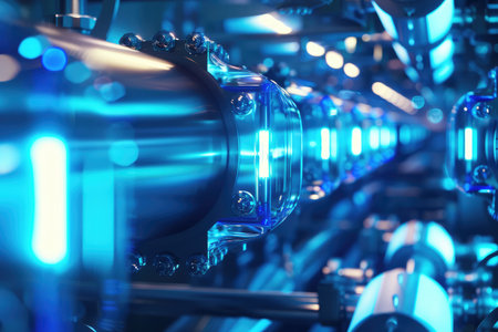 A captivating image showcasing a modern industrial setting featuring transparent tubes illuminated by a blue light, with a digital temperature gauge clearly displaying values.