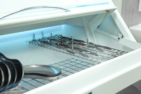 Ultraviolet sterilizer with ENT medical instruments, closeup view