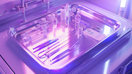 Illuminated healthcare worker sterilizing medical instruments with ultraviolet light technology