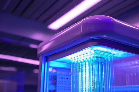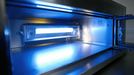 A modern sterilization chamber featuring a vibrant blue UV light, designed for effective disinfection and enhanced hygiene in medical environments.