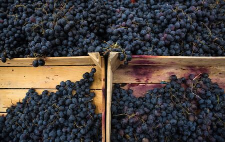 boxes of ripe grapes after the harvest in September