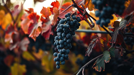 Bunches of red wine grapes on vineyards in autumn.