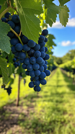 Detailed view of ripe blue grapes hanging on a vine, surrounded by lush green leaves. The natural setting highlights agricultural and organic vineyard themes.