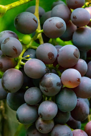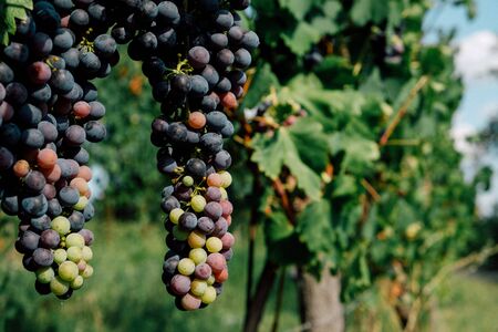 Grapevine close-up. Ripe red grapes hang in a cluster on a green vine in the vineyard. Black maiden grapes, large bunch. Delicious and healthy fruits, fresh autumn harvest.