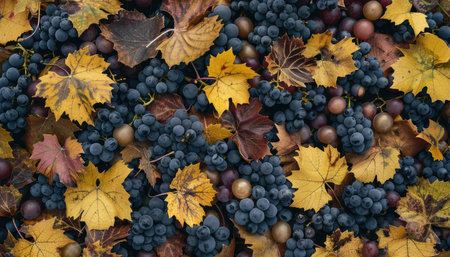 Wine grapes and autumn leaves on the ground. Top view.