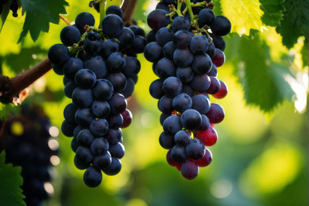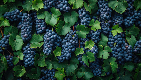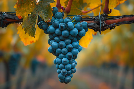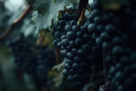 Ripe, dark skinned wine grapes hang heavy on the vine, ready for harvest, in a close up view that captures the essence of vineyard life