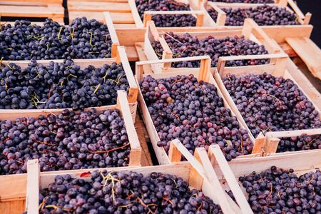 Tasty juicy grapes in wooden boxes