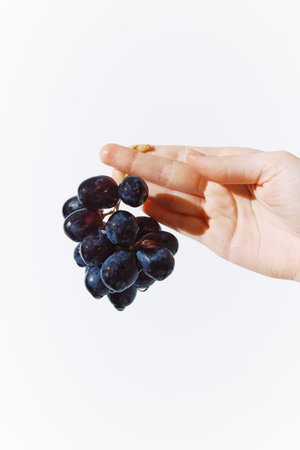 Hand holding black grapes on white background with copy space for text
