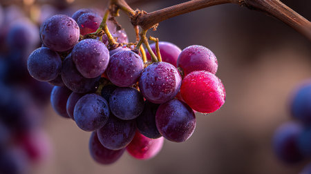 Dew-Kissed Crimson and Purple Grapes Hanging from a Vine Ready to Eat