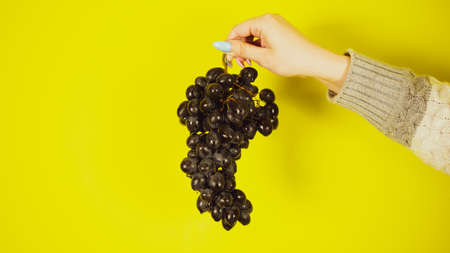 Person holding bunch of ripe black grape. Crop hand demonstrating bunch of ripe wet grape on bright yellow background