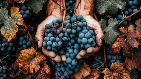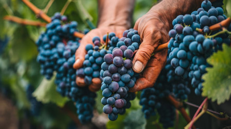 Close up of farmer s hands picking ripe grapes, showcasing textures and colors of leaves and fruits