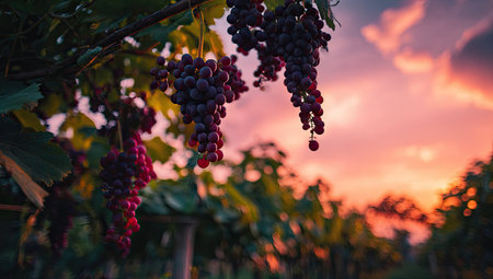 Bunches of ripe red grapes on vineyards at sunset.