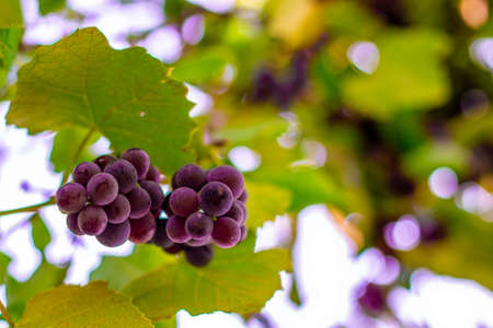 Bunch of blue grapes in the vineyard at sunset before harvest. Close-up