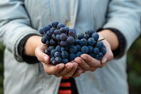 Closeup of a hand with blue ripe grapes. Fresh blue bunches of grapes. The concept of winemaking, wine, vegetable garden, cottage, harvest