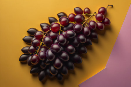 Black grapes on a yellow and pink background. Flat lay, top view. ai generated