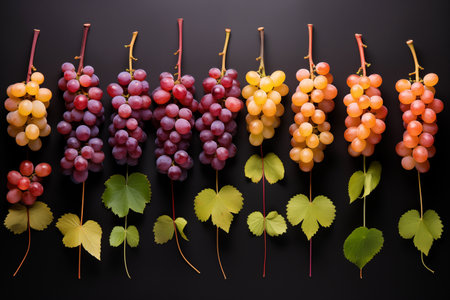 Different ripe fresh grape varieties. Colorful fruit on black background. Generative AI