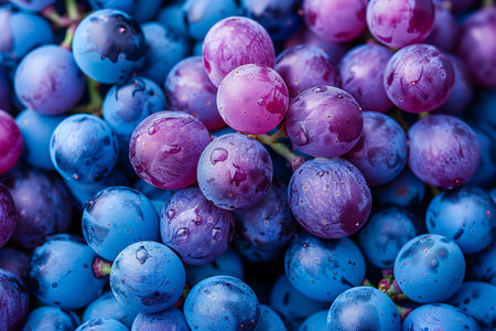 Close-up view of purple grapes covered in dew droplets, each grape glistening with captured moisture and vibrant hues.