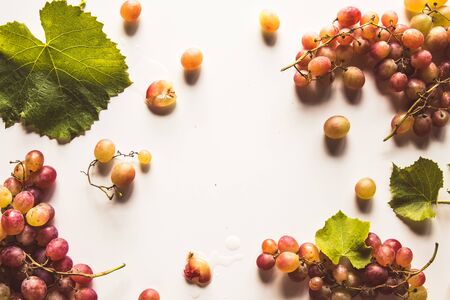 Bunches of red wine grapes with green leaves. Top view.