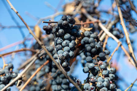 Blue wine grapes. Grapes for making wine. Detailed view of Cabernet Franc blue grape vines in the hungarian vineyard in autumn, Hungary