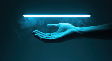 Hand extends under a cool blue LED light source, illuminated with smoke effect. Modern design for technology, science, or healthcare concepts.