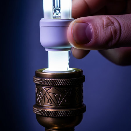 A close-up view of a futuristic syringe featuring a transparent vial filled with glowing blue particles, representing cutting-edge technology in medical applications and research.