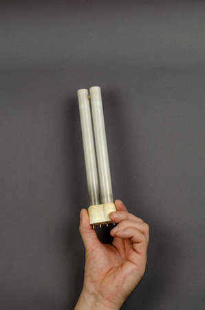 A hand holds a burnt-out fluorescent lamp on a gray background. An old electric lamp for a table lamp. Side view.