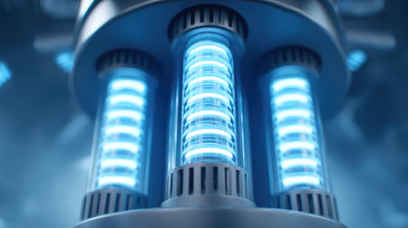 A high-tech laboratory scene showcasing transparent test tubes illuminated by soft blue light, emphasizing advanced scientific experimentation and research equipment for innovative processes.