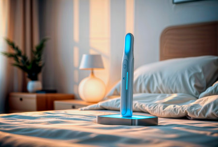 Modern insect trap emitting light in a cozy bedroom to keep mosquitoes away while sleeping.