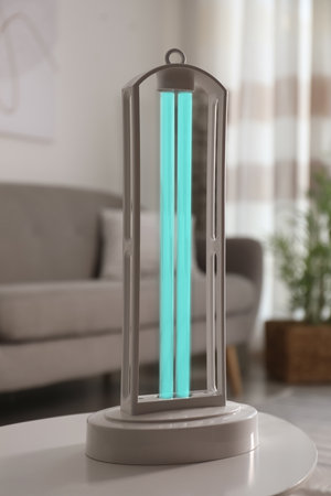 Uv light sanitizer emitting a bright blue light, disinfecting a room
