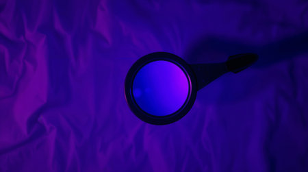 A round magnifying glass with a purple lens rests on a textured surface. Background is softly illuminated, creating a moody atmosphere