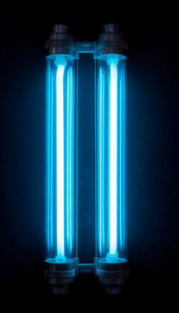 Vibrant blue ultraviolet tubes cast an eerie glow in a dark setting, creating a mysterious, futuristic atmosphere perfect for sci-fi or nightlife them