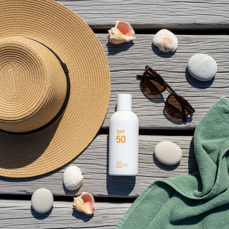 Harsh light illuminates a straw sunhat and a bottle of high SPF sunscreen on a tilted wooden table.