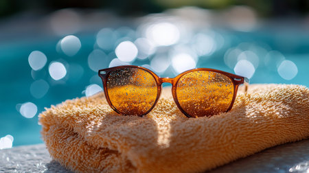 Golden sunglasses are placed on a soft towel beside a glimmering pool under the sun, capturing water droplets and radiating summer vibes.