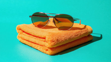 A pair of stylish sunglasses resting on plush orange towels against a vibrant teal background, capturing the essence of summer relaxation and outdoor fun.