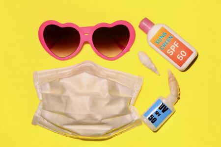 Sunscreen and glasses on the beach. Selective focus. Travel.
