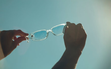 Asian female holding sunglasses in hands towards the sun and rays passing through it with lens flare