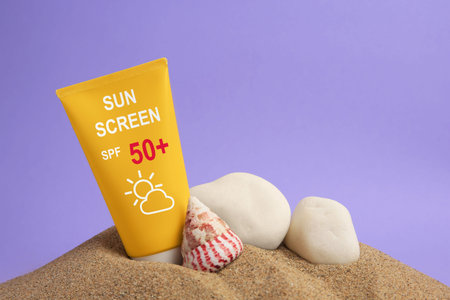 Sunscreen in tube, stones and seashell on sand against lilac background. Sun protection product