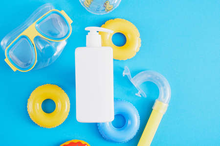 set for beach recreation and diving, sun cream or sun protection and toy inflatable circles on a blue background, mock up blank white cream bottle