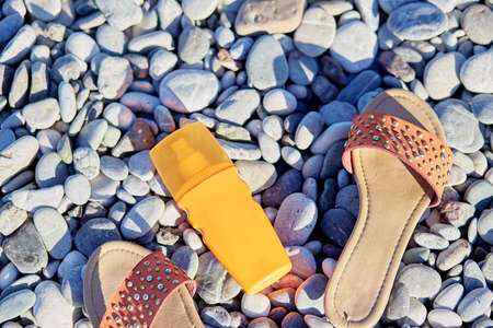 Mock up of sun cream, summer slippers and hat on the beach. Concept of spa, beauty, cosmetic, suncream and moisturizer. Summer concept. High quality photo