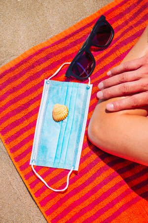 high angle view of a caucasian man, lying face down on a colorful orange towel on the beach, next to his sunglasses, a seashell and a blue surgical mask