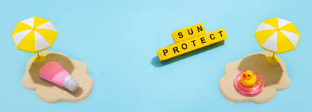 Summer skin care concept. Sunscreen, duck in inflatable ring, sand and sun umbrella