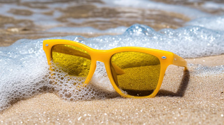 Close-up of yellow sunglasses on beach sand, with pool waves and sunlight creating dreamy reflections