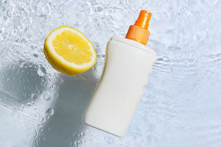 White beauty product sunscreen cream vial tube bottle in transparent fresh water with flecks and waves, dark shade. Body skin care protection in hot summer beach. Flat lay.