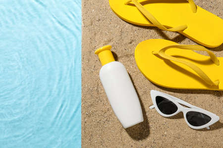 Sunscreen cream with sunglasses and flip flops on edge of swimming pool