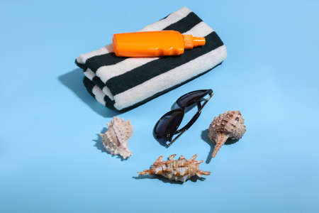 beach holidays. Towel, sunglasses, seashell and sunblock bottle on bright blue background.