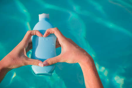 The hands of a young girl, in a blue swimsuit and shorts are going to smear on themselves a cream for sunbathing and protection from the sun against the background of the beach.