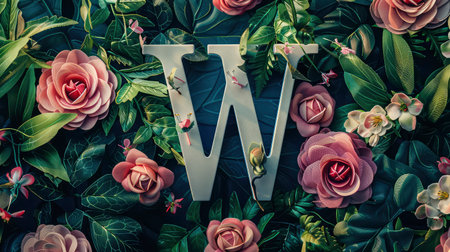 Letter W made of paper flowers and leaves on dark green background.