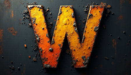 The image features a large, weathered letter W in vibrant orange and yellow hues, set against a dark, textured backdrop. The letter is adorned with rust and imperfections, evoking a sense of vintage charm and industrial aesthetics.